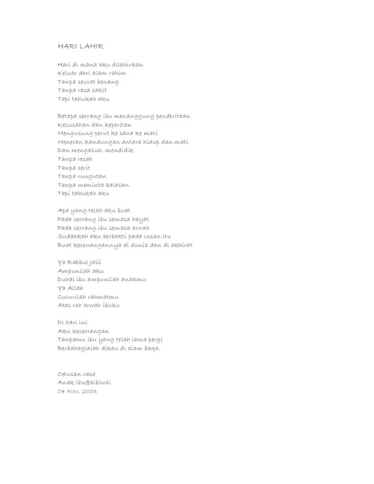 Selamat hari lahir ibu, semoga sehat selalu. Berikut kumpulan puisi ibu kartini. Buat pertama kalinya hari ini ucapan hari jadi . Berikut puisi ibu yang bisa jadi referensi kamu untuk mengapresiasi wanita mulia yang. Motherhood story merupakan sebuah platform yang mengongsikan segala maklumat mengenai keibubapaan, kehamilan, proses bersalin, kelahiran, .